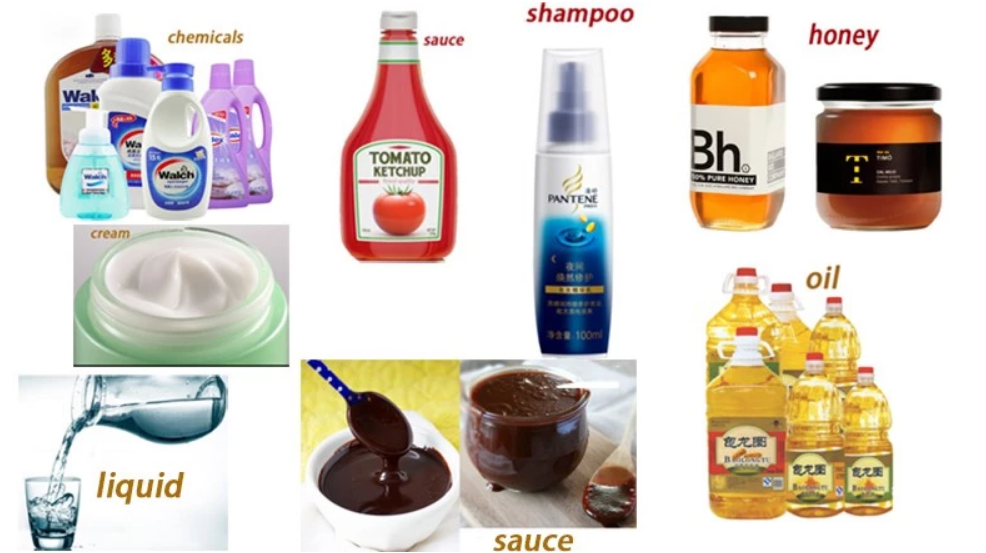 Cairan semik-viscous lan viscous; catsup, mustar, sirup, salsa, mayonis, madu, butter kacang, jellies, dicelupake sose, lip balm, shampoo, sabun tebal, gali, rai rai, lilin, lem, grease, sealant, silikon lan sapanunggalane.
