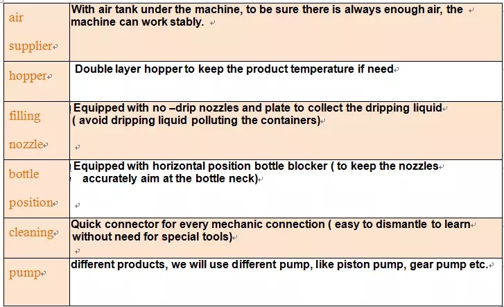 Mesin iki digawe khusus kanggo kabeh jinis keluwesan / cairan ing industri panganan, industri kimia lan komoditas, kayata minyak mesin, minyak motor, salad, gel cuci tangan, minyak klapa, saus kacang, wijen, sampo, sabun cair, minyak mesin , minyak lenga, minyak masak, saos tomat, wedang, minyak es, minyak sayur, madu, saus lada, butter kacang, yogurt, jus, minuman lan sapanunggalane kabeh sing dihubungi karo cairan / saus yaiku stainless steel. nganggo pompa piston kanggo ngisi. Kanthi nyetel pompa posisi, bisa ngisi kabeh botol ing mesin siji, kanthi cepet lan tliti kanthi dhuwur.